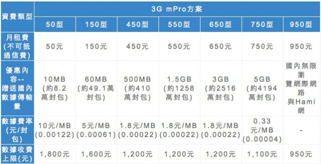 中華電信 mPro 新增 550/650 兩種費率