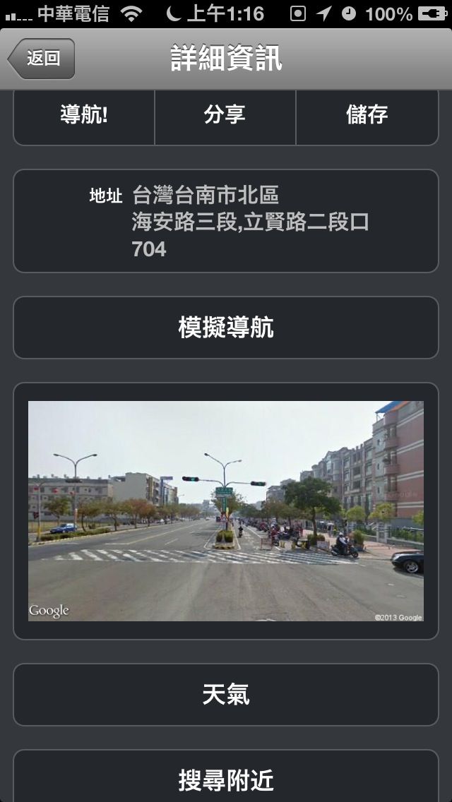 ▲導航王的聲控介面,與 Garmin 的 Google 街景(放在詳細資訊中,模擬導航也放在這喔~)