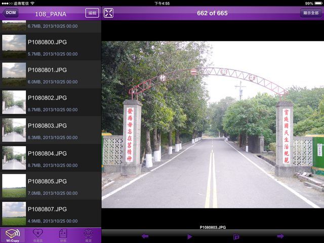 打開 iPad Mini 將無線網路連上 DW21,然後開啟 Wi-Copy 的 App。就可以進記憶卡中看要讀入哪些照片,程式可以多選,並且也蠻自由的複製或移動。可惜的是它在進行目標選擇時,無法在那當下建立資料夾,得先一開始就建立好。不過也沒關係,因為我是想用前幾天剛發佈的 iPhoto for iOS 來處理,所以直接通通丟進系統的「相機膠捲」。