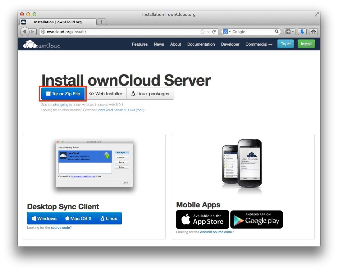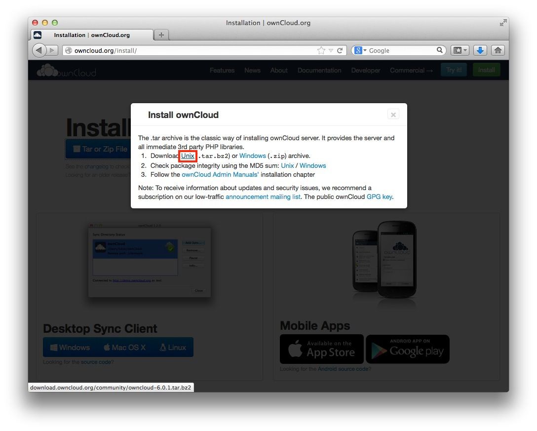 首先,到官網下載 ownCloud 檔案,見下圖步驟。抓 unix 系的就好,OS X 有解壓 .tar.bz2 的能力。
