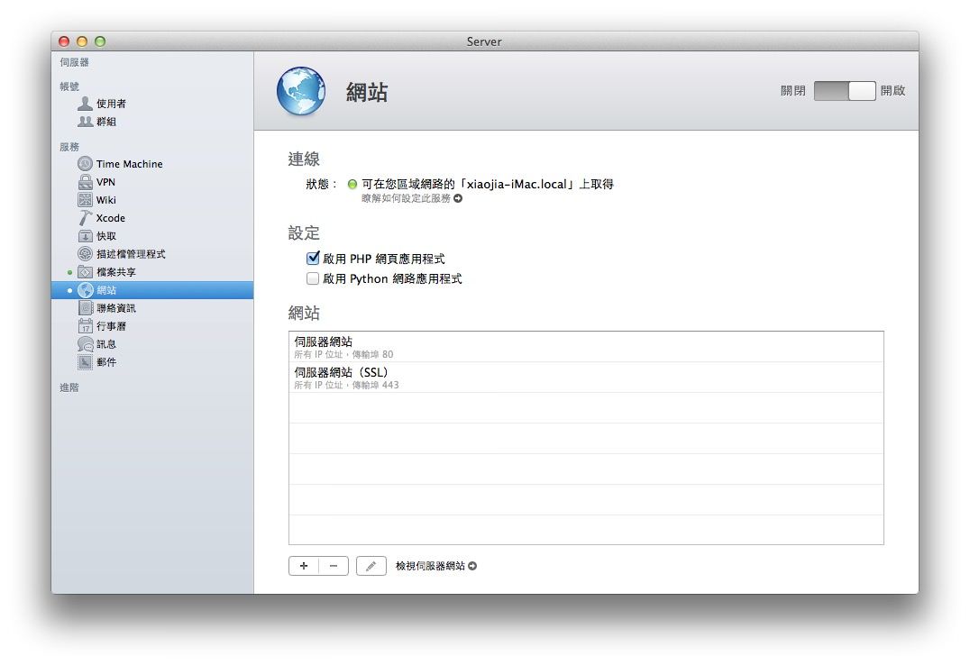 然後,最大的差別大概只在預設的網頁檔案目錄了。MAMP 是在「/應用程式/MAMP/htdocs」,OS X Server 在「/資源庫/Server/Web/Data/Sites/Default」底下。