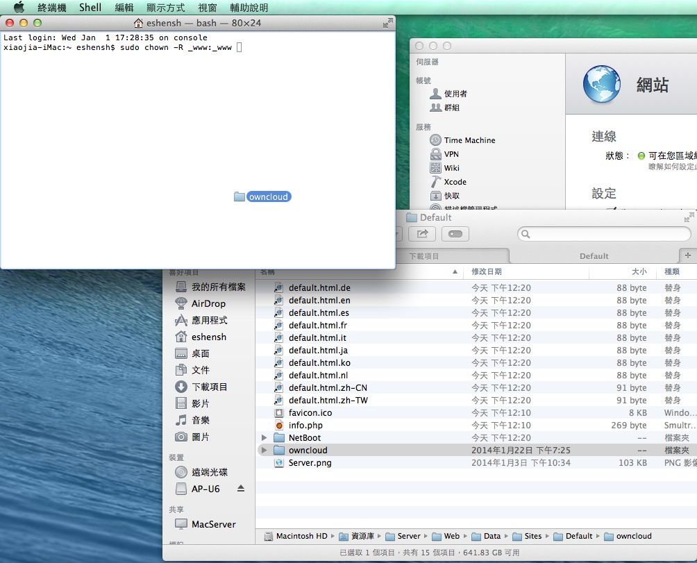 6. 為什麼要做這些?因為 OS X 是個有權限控管的系統,把檔案的所有權給網頁伺服器,這樣才能正常運作,不然你等一下絕對會看到錯誤訊息,這也就是為什麼我說這是個眉角撇步啦~
