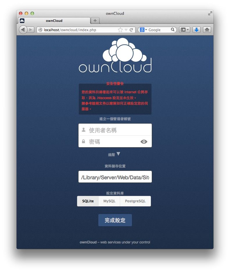 一切正確完成的話,現在開瀏覽器就可以開始設定了。在瀏覽器中的網址列輸入「http://localhost/owncloud」,就能進入初次設定的畫面。