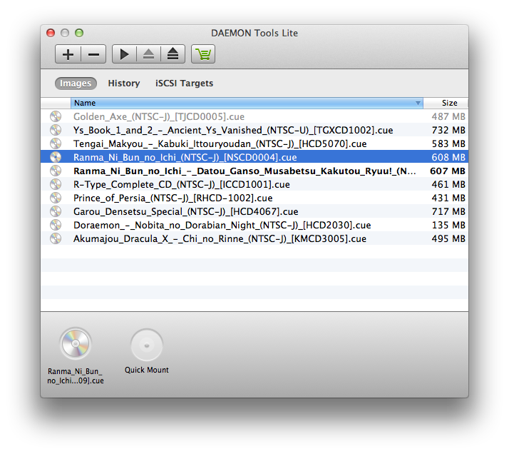 Daemon Tools Lite for Mac:有名的虛擬光碟掛載軟體,免費,支援多種格式,其中就包括 .cue。可以在 Mac 中掛載 PC-E CD 的遊戲。(建議:去系統偏好設定把「一遇音樂 CD 開 iTunes」的設定關閉)