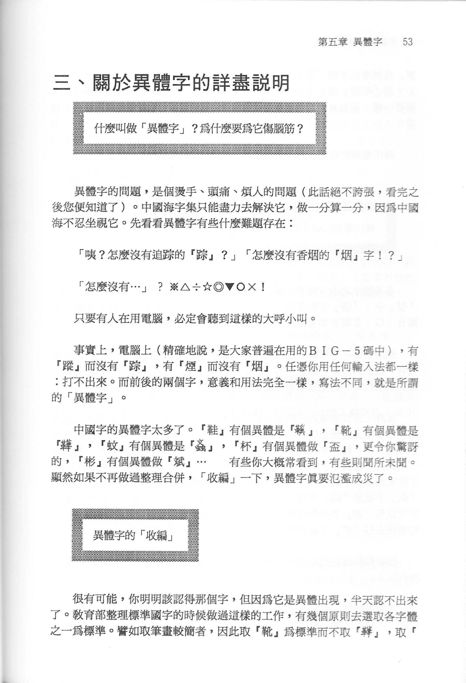 簡單地說,Big-5 (或該說標準字集)對字的收錄是很奇怪的,沒有上段的那些常用字,卻有「嘂、尐、櫑、弢、讟、袌、巹…」等一般人一輩子大概用不上一次的字。
