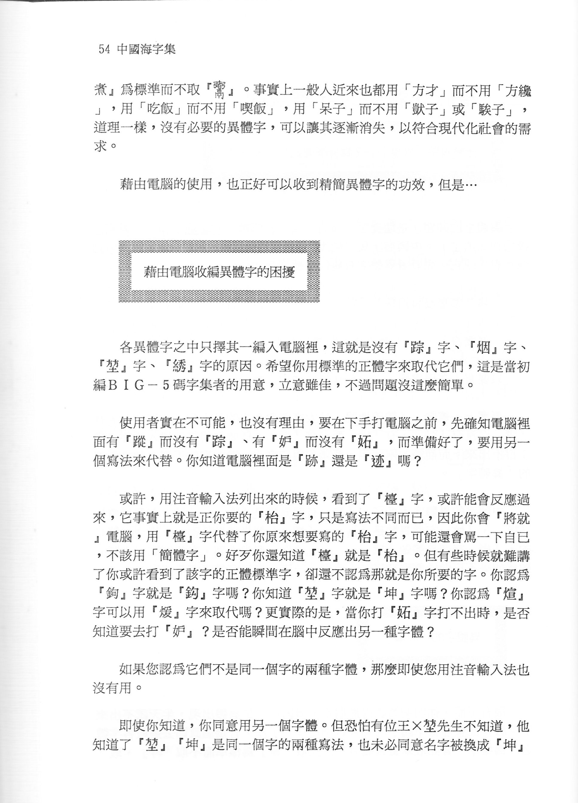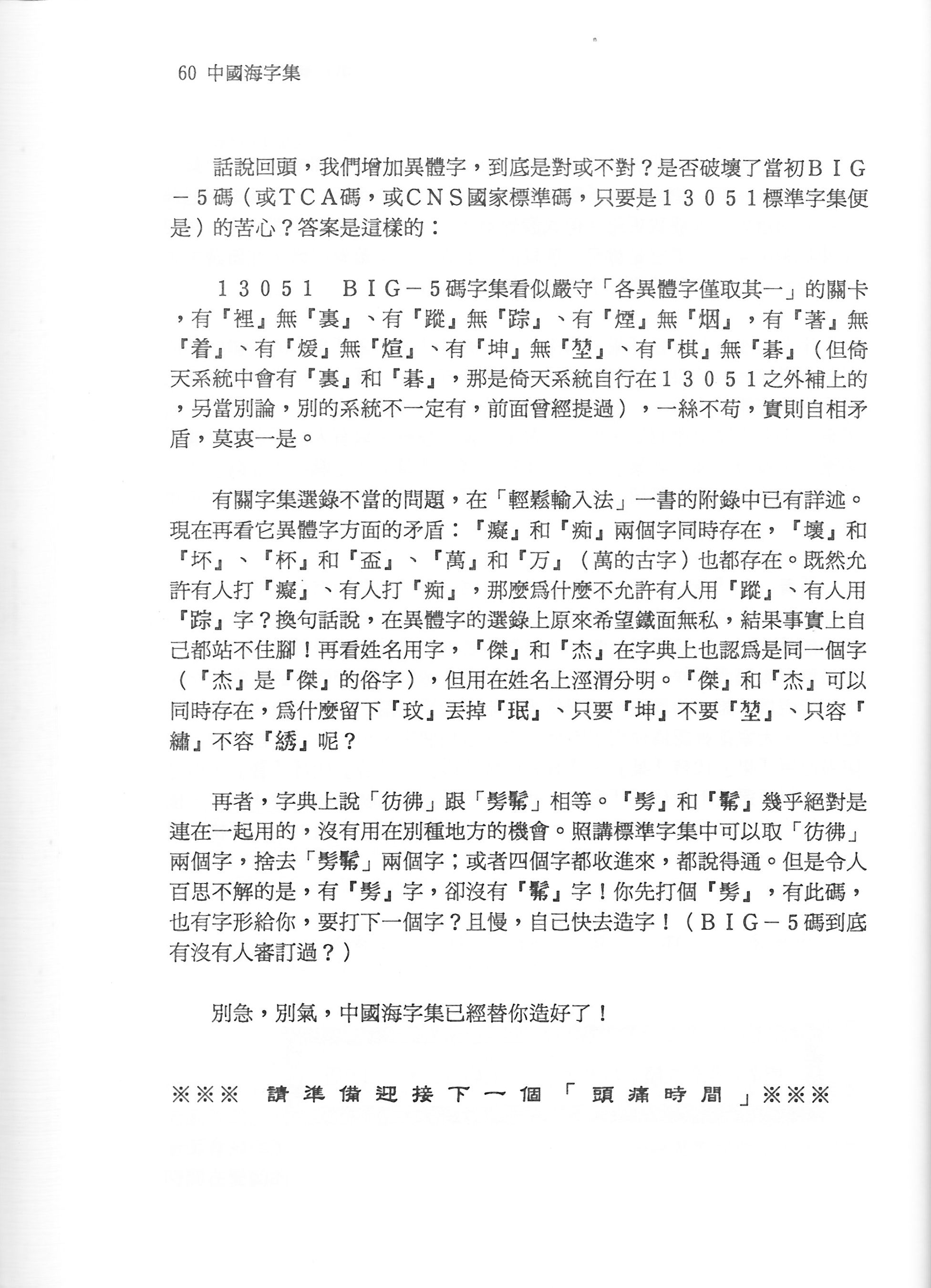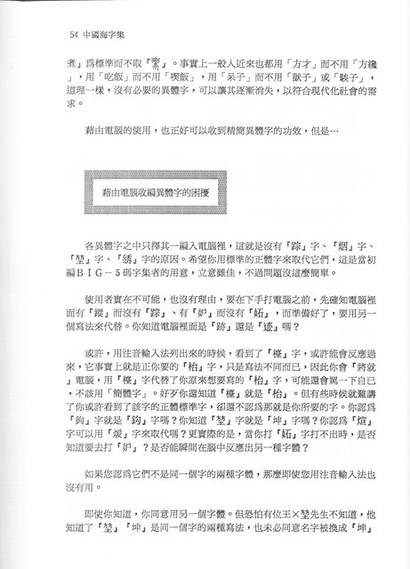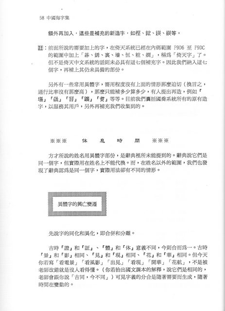 會不會覺得有點心驚膽跳?因為這些你完全不陌生的字,竟然需要另外補上?那我再舉些例子好了:Big-5碼加上這個倚天擴充,還是沒有前行政院長的名字最後一字 ~ 游錫「堃」。讓我們水牛院長在 PTT 只好很鬱悶地取個 fanfantu2014(方方土2014) 的 ID 自嘲。王建「火宣(煊)」、陶「吉吉(喆)」也都查無此字,最可憐當屬「碁峯圖書」了,「碁」字得到倚天擴充,但是「峯」字還是沒有,它還是一家資訊圖書公司,想來令人不免有點啼笑皆非。