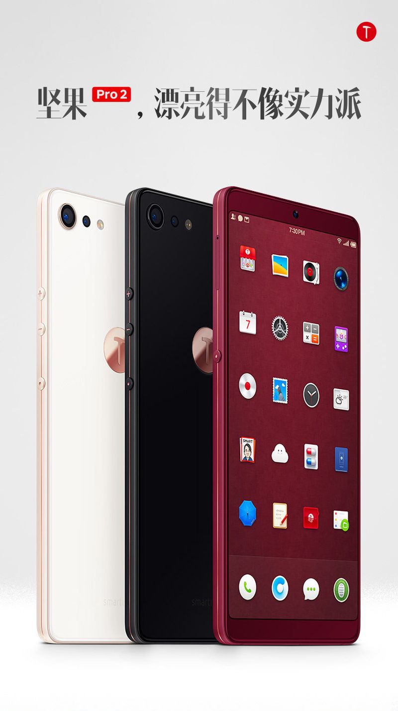 時隔半年,錘子在 2017 的秋季發佈會上,發佈了「堅果 Pro 2」。背面縮小一顆的雙攝、指紋與LOGO結合,前面極簡到極至的風格,加上京東的即時供貨,開箱評測也很快出來,證明解決了「堅果 Pro」的短板,除了部份個人美學外也沒太大問題,於是也就有了「老羅這次成了」的聲音。