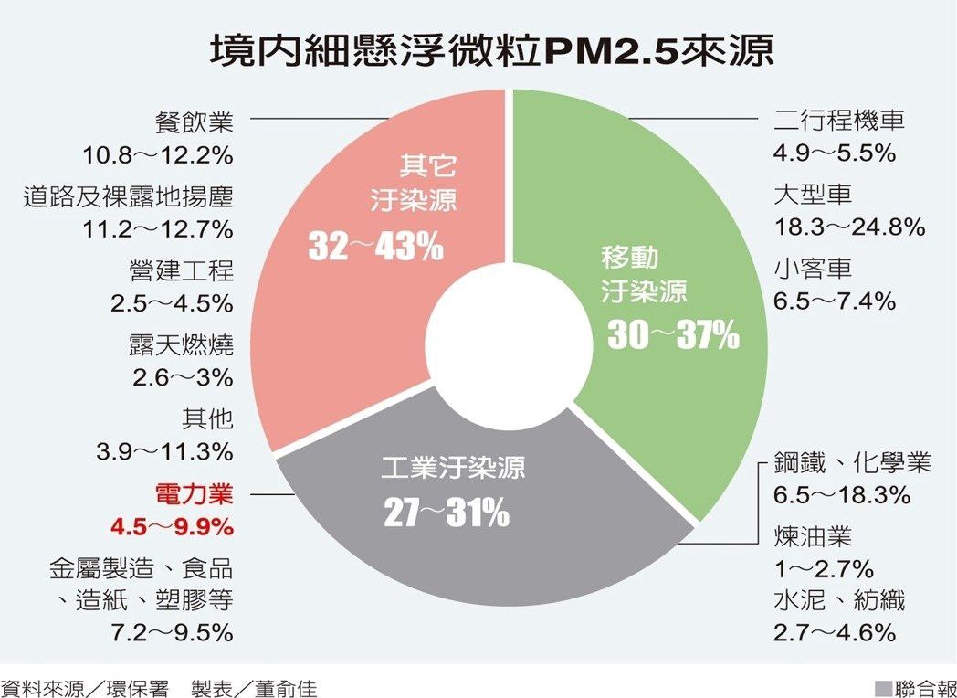 既然電力業僅 4.5%(9.9% 是某個使用他獨創算法的教授其研究結果,參考用就好),那麼降低火力發電量,對空污有多少的影響力,還是挺值得商榷的…