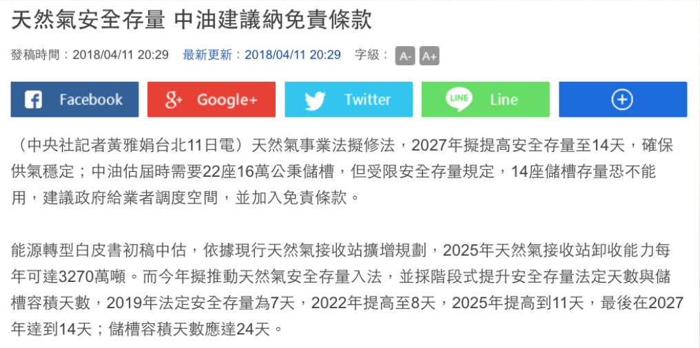 台灣的能源 98% 都來自進口,尤其天然氣都是坐船來的,目前台灣的天然氣儲存空間不足,存量一般只夠燒不到一禮拜。還想多設電廠多燒,那庫存量就更不足了。