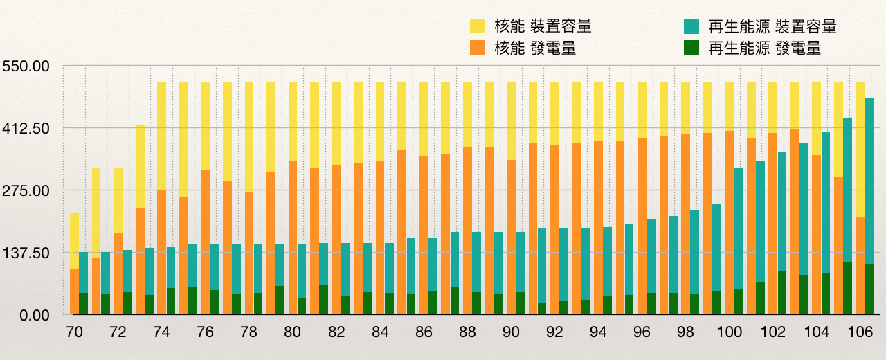 以【非核家園】作為先決條件,那勢必只能提升「火力」與「再生能源」。先來看看再生能源吧,我們將上面的比較圖,只取出核能與再生能源的部份。