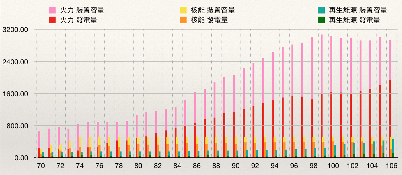 同樣的,當【2025 非核家園】成為主要政策方向,其他的部份也必需動起來。台灣的能源,按類別可以分為火力(燃煤、燃氣、燃油、汽電共生)、核能、再生能源(水力、太陽能、風力),我們先看看歷年來裝置容量的發展,與發電量的比較圖。