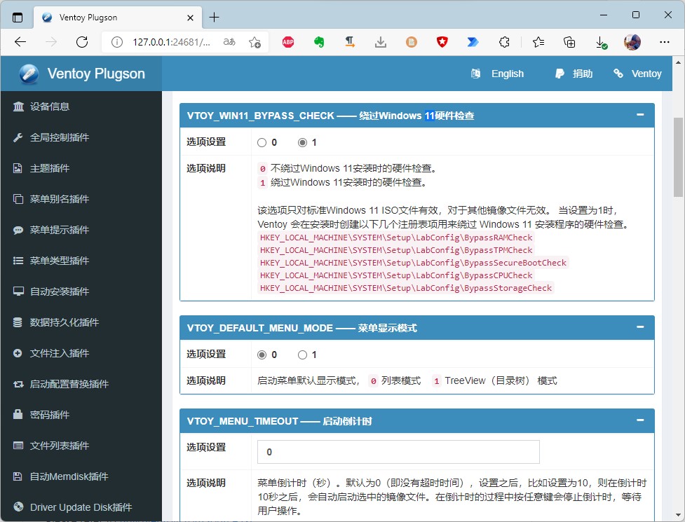 這邊可以設定很多 Ventoy 的進階功能,與開機行為 ,包括替 Windows 11 光碟檔繞過硬體檢查,方便在舊機器上安裝等等的。有興趣可以自己再讀看看這些設定。