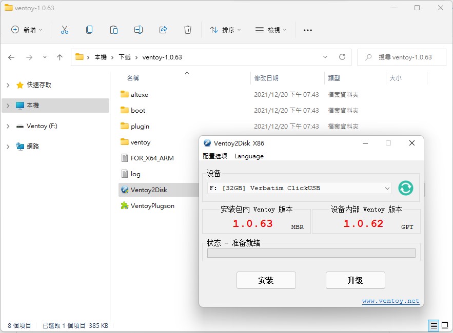 然後打開 Ventoy2Disk,選擇隨身碟的位置,就可以安裝進去了。以後有新版,也可如此「升級」,這就是系統與資料分區的好處。