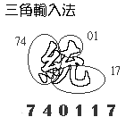 六碼的輸入法最具代表性的就是黃克東先生的 【三角輸入法】,他將一個字 分成三個角,每個角用兩位數字代表,因此以每字六碼進行輸入。例如 「統」字的三角號碼是740117。